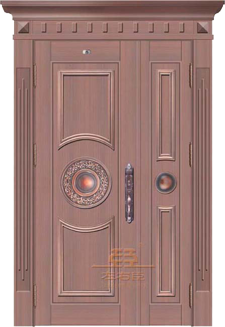 产品加工:1.钢质材料经过抗氧化处理后,剪板折弯,焊接成型,2.紫铜板经过氧化拉丝封釉,剪板折弯,依照钢 内胆大小做处各分件后,粘贴于内胆表面,手工工制作成分较多,故此铜门对手工要求是比较高的