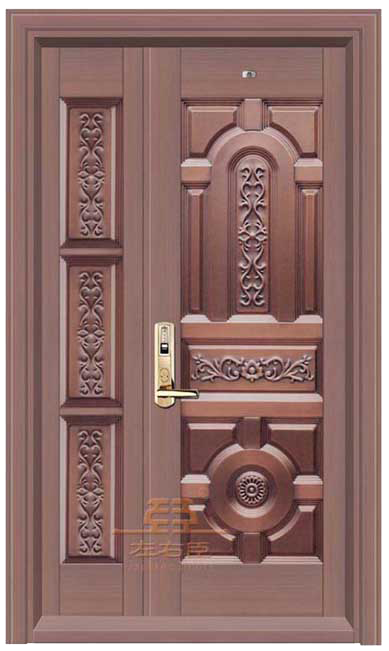 产品加工:1.钢质材料经过抗氧化处理后,剪板折弯,焊接成型,2.紫铜板经过氧化拉丝封釉,剪板折弯,依照钢 内胆大小做处各分件后,粘贴于内胆表面,手工工制作成分较多,故此铜门对手工要求是比较高的