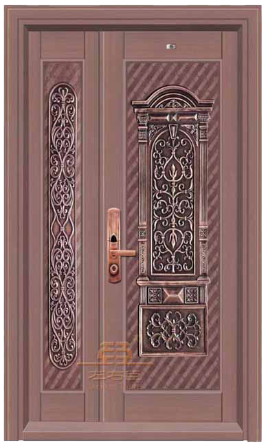 产品加工:1.钢质材料经过抗氧化处理后,剪板折弯,焊接成型,2.紫铜板经过氧化拉丝封釉,剪板折弯,依照钢 内胆大小做处各分件后,粘贴于内胆表面,手工工制作成分较多,故此铜门对手工要求是比较高的