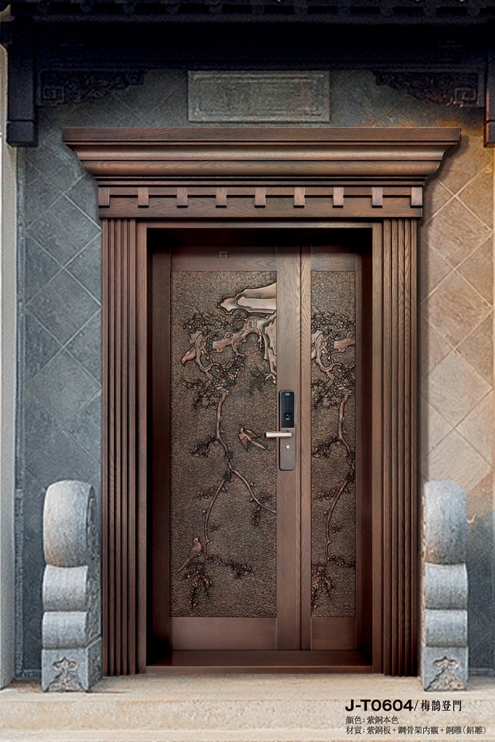 产品加工:1.钢质材料经过抗氧化处理后,剪板折弯,焊接成型,2.紫铜板经过氧化拉丝封釉,剪板折弯,依照钢 内胆大小做处各分件后,粘贴于内胆表面,手工工制作成分较多,故此铜门对手工要求是比较高的