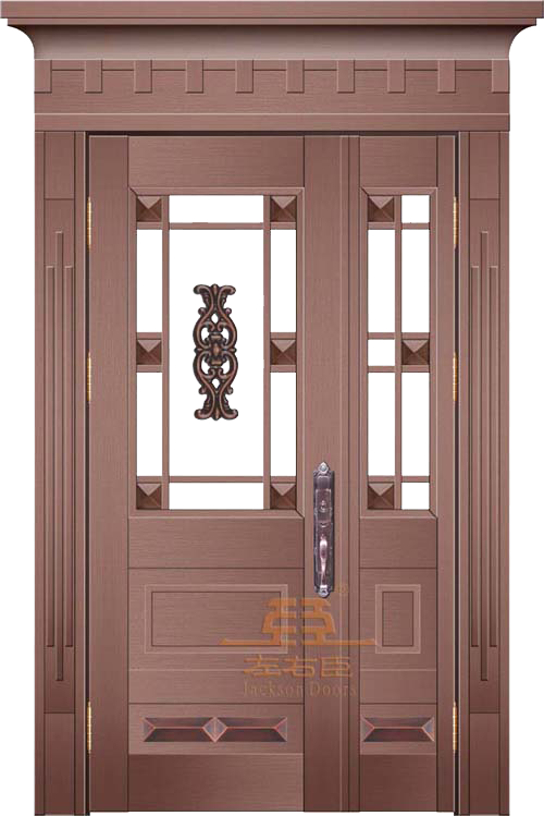 产品加工:1.钢质材料经过抗氧化处理后,剪板折弯,焊接成型,2.紫铜板经过氧化拉丝封釉,剪板折弯,依照钢 内胆大小做处各分件后,粘贴于内胆表面,手工工制作成分较多,故此铜门对手工要求是比较高的