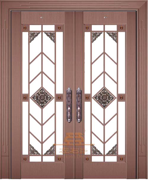 产品加工:1.钢质材料经过抗氧化处理后,剪板折弯,焊接成型,2.紫铜板经过氧化拉丝封釉,剪板折弯,依照钢 内胆大小做处各分件后,粘贴于内胆表面,手工工制作成分较多,故此铜门对手工要求是比较高的