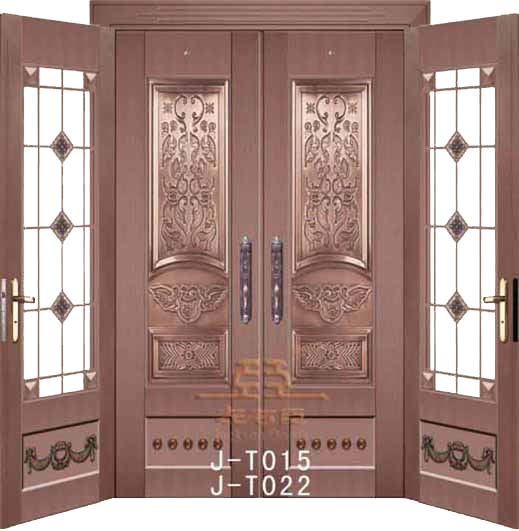 产品加工:1.钢质材料经过抗氧化处理后,剪板折弯,焊接成型,2.紫铜板经过氧化拉丝封釉,剪板折弯,依照钢 内胆大小做处各分件后,粘贴于内胆表面,手工工制作成分较多,故此铜门对手工要求是比较高的