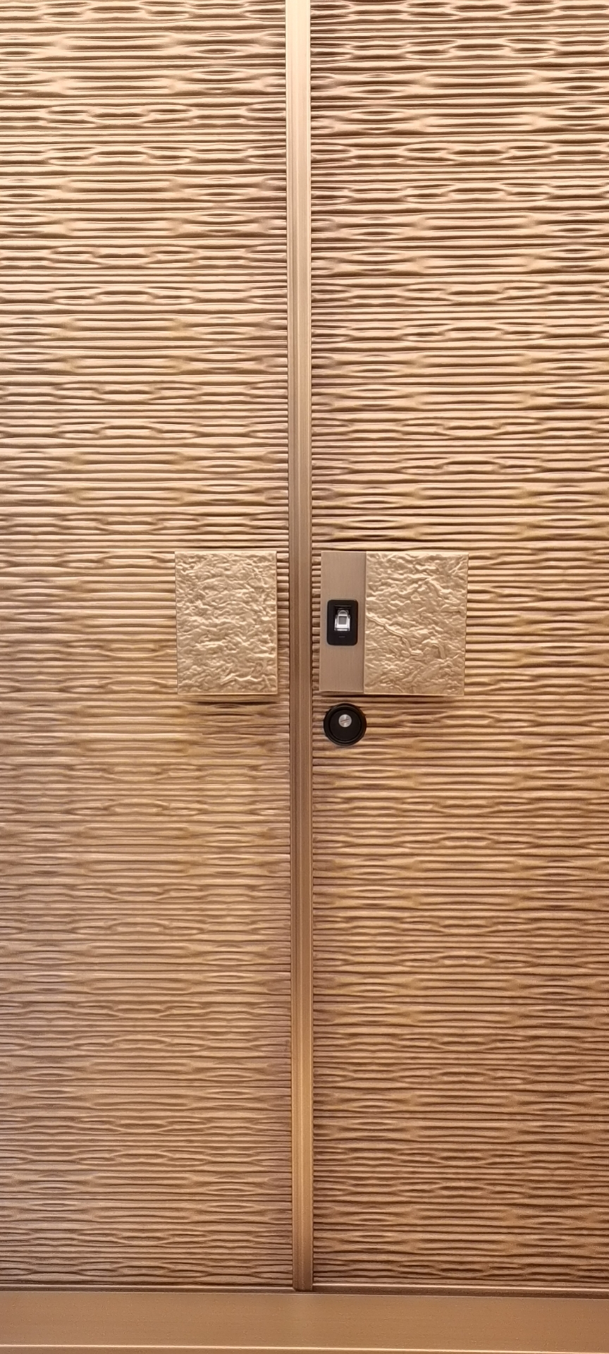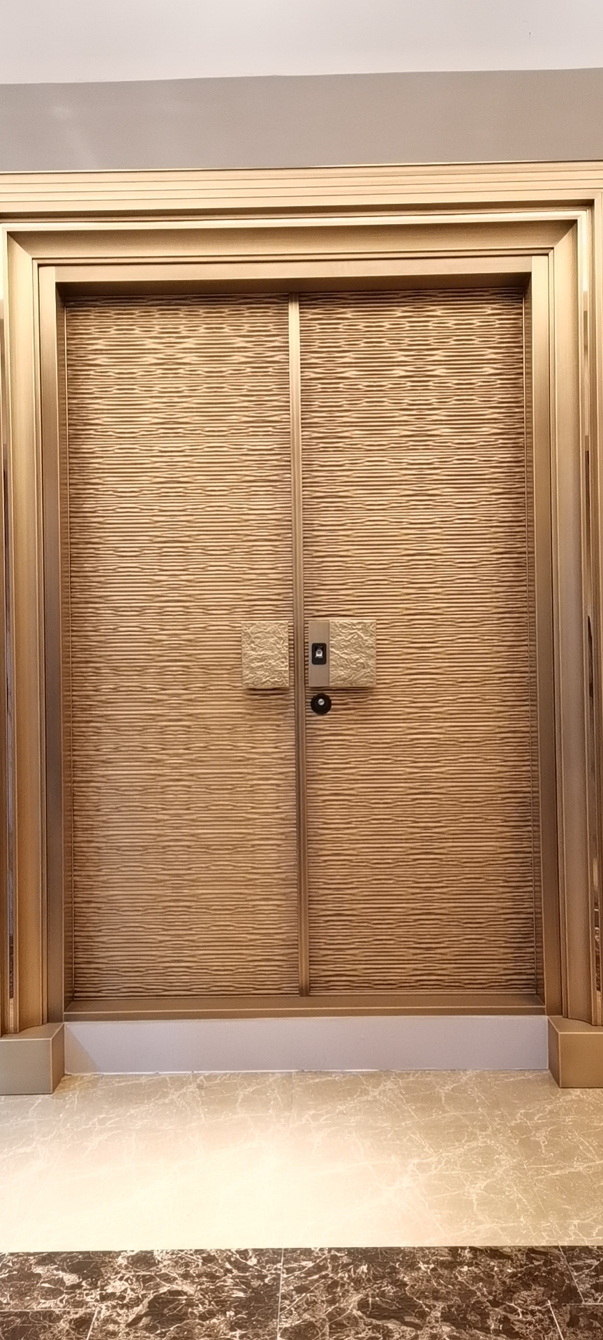 别墅大门的高级配置:精铸暗合页,实心黄铜拉手,藏式指纹锁,备用钥匙,门的包边可以做罗马边,加个门头,也可以用简约线条,限于现场尺寸限制,线条门头可以做大做小,并相应调整比例,以达到客户要求。